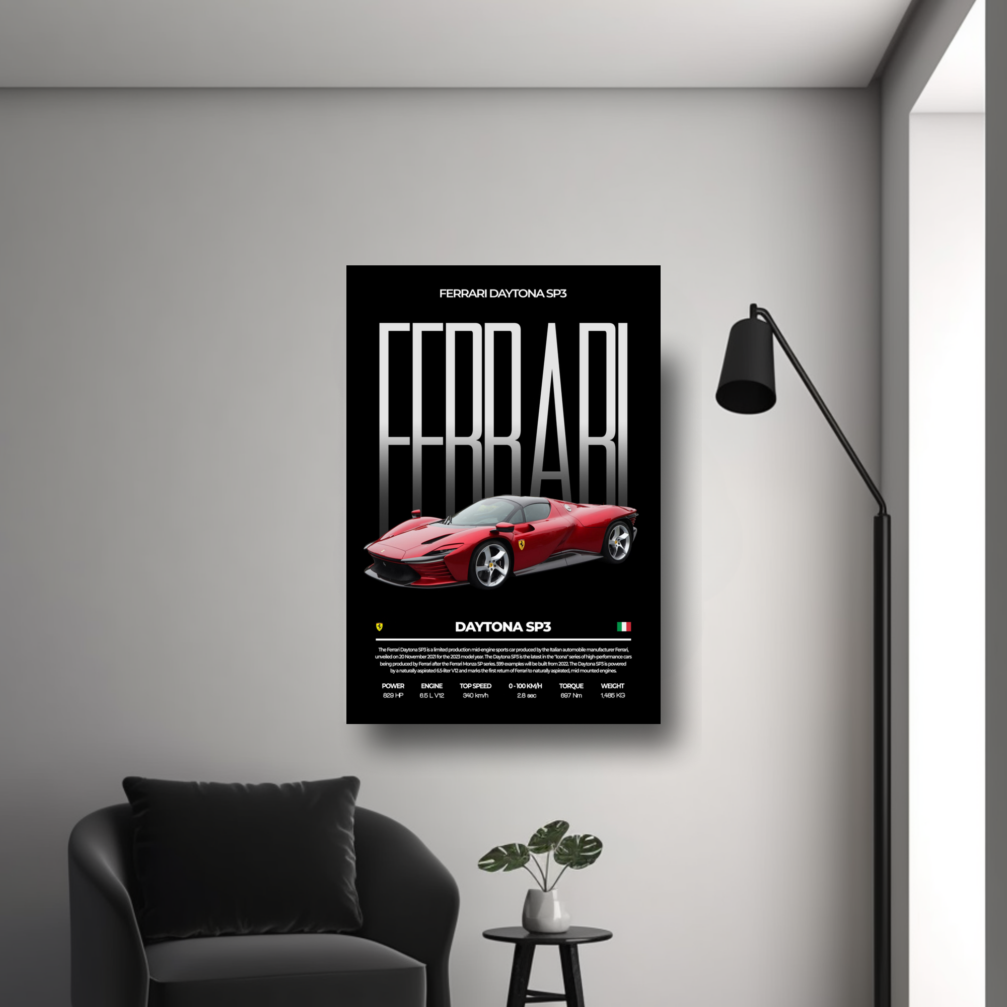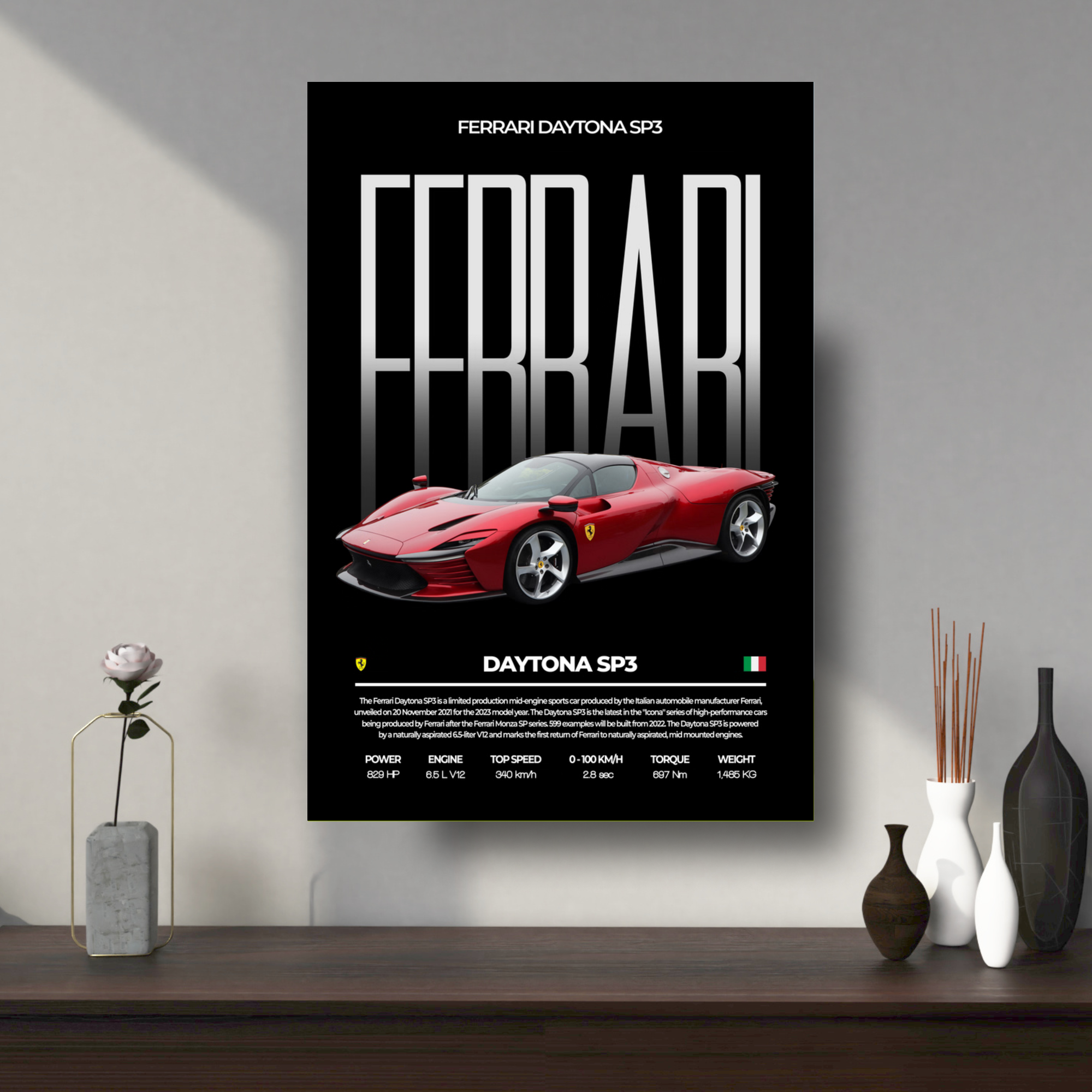 High-quality Ferrari Daytona SP3 metal poster built with premium metal.