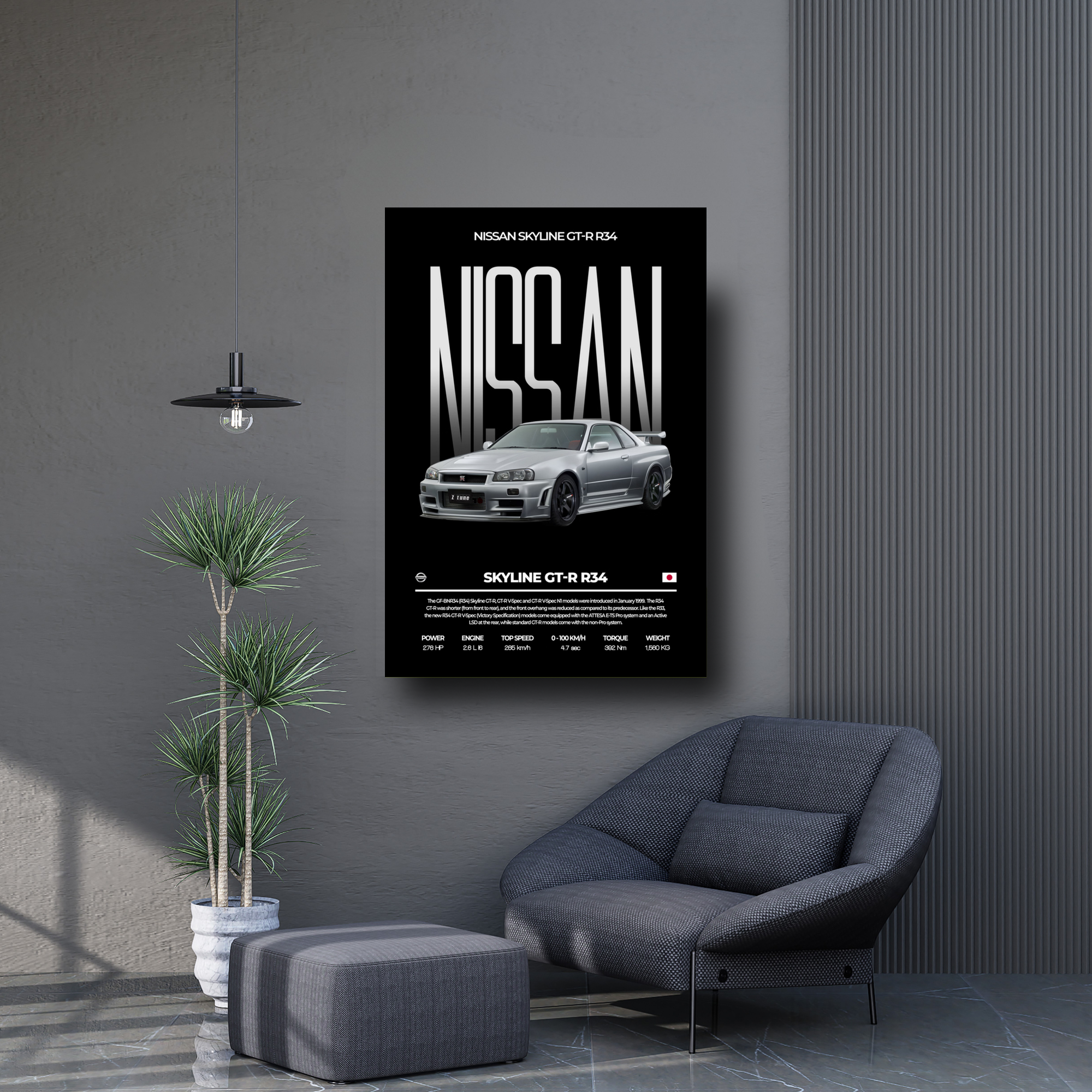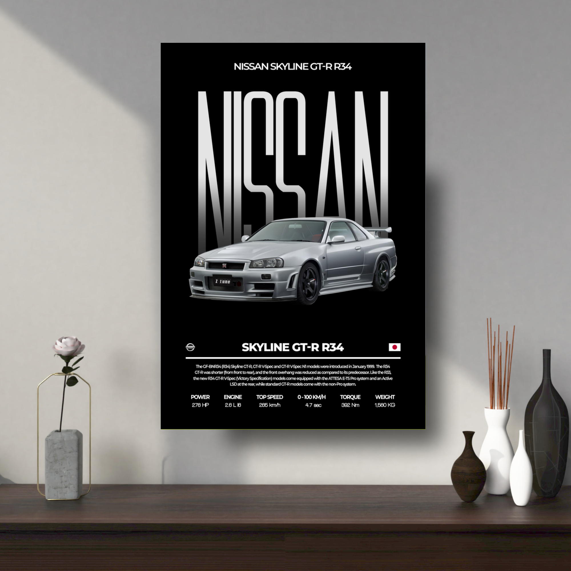 High-quality Nissan Skyline GTR R34 metal poster built with premium metal.