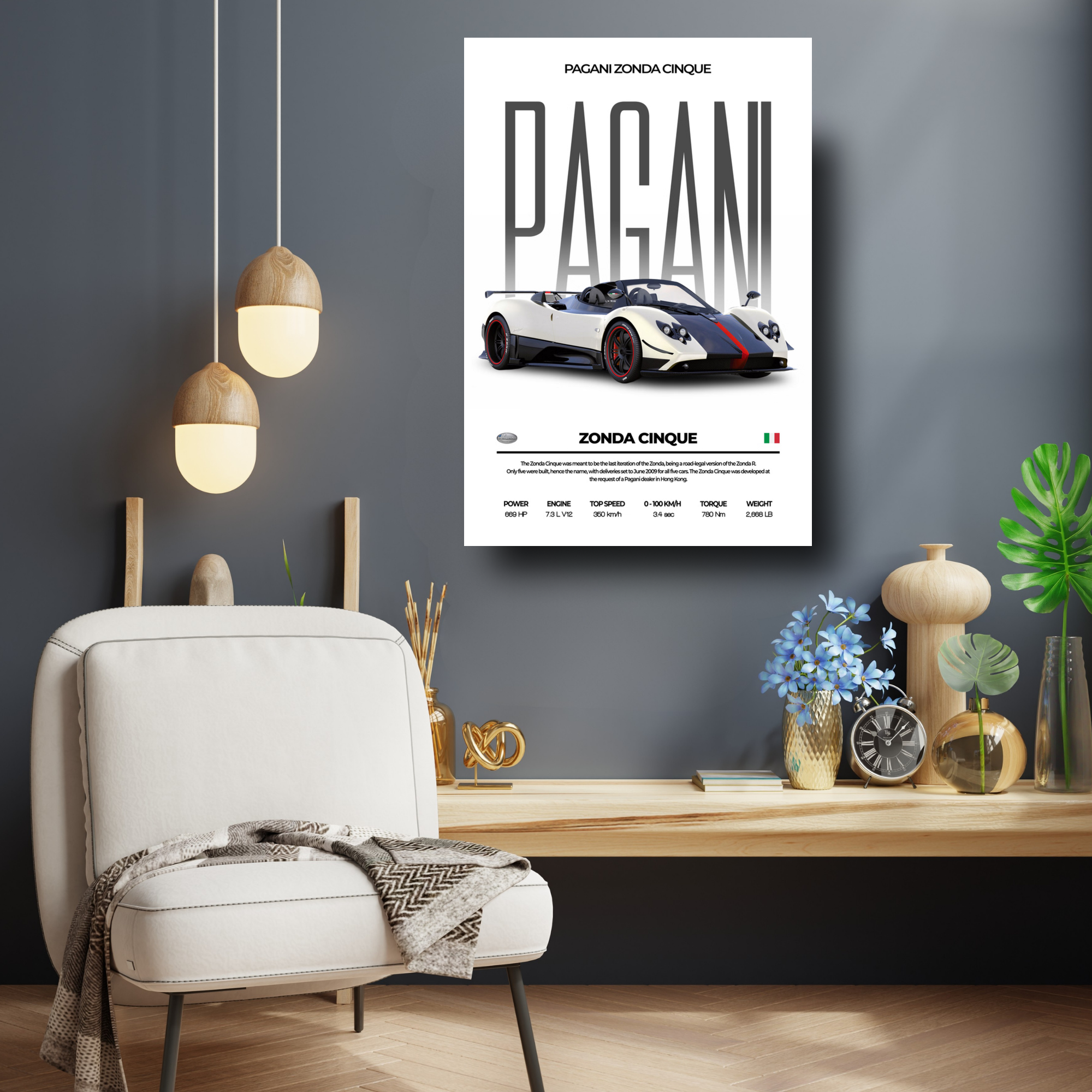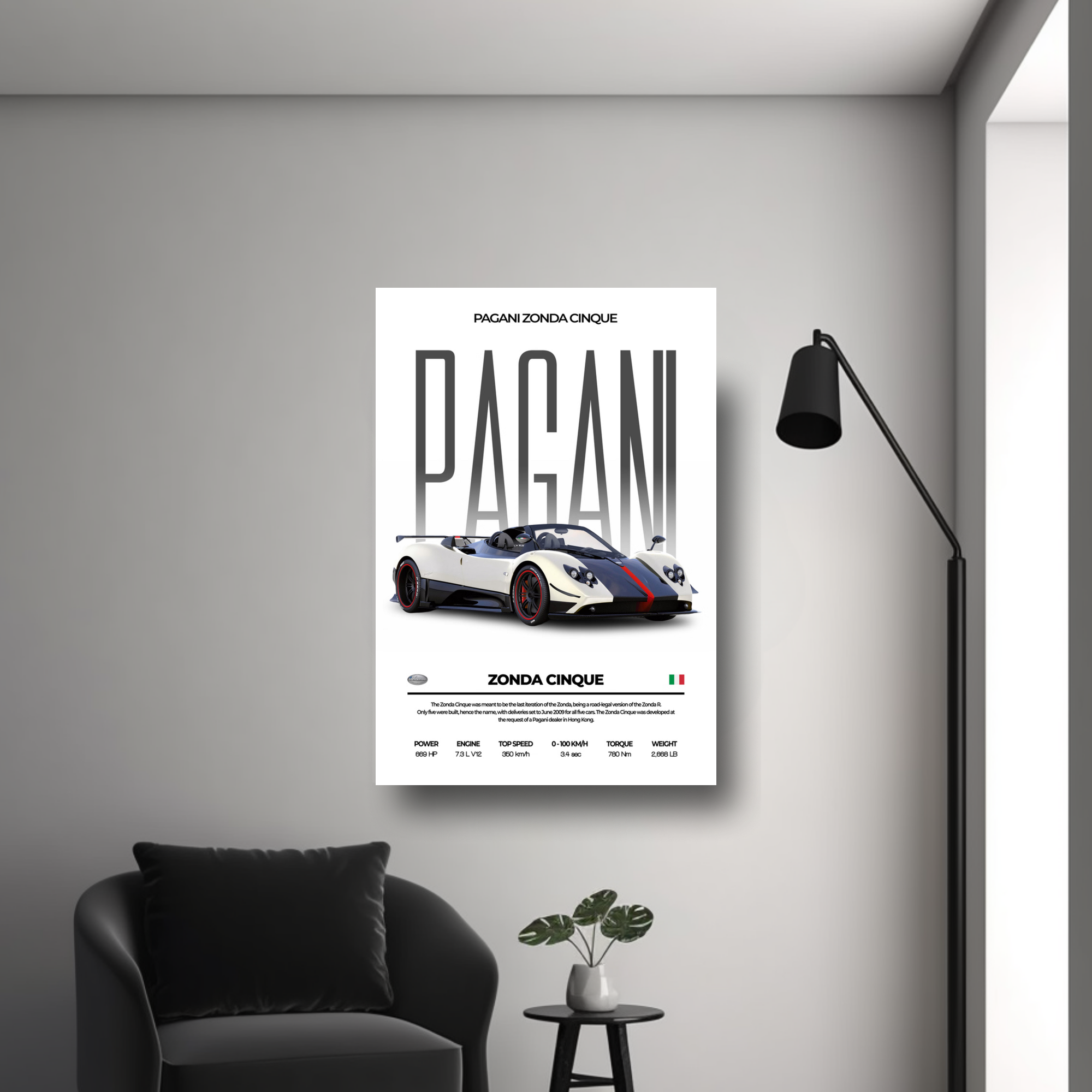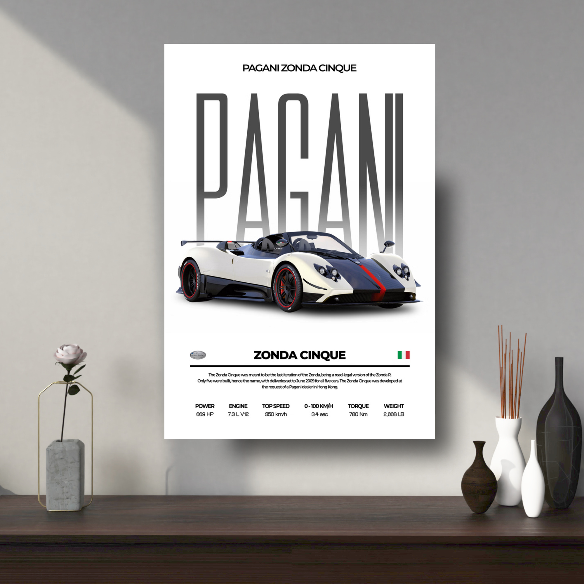 High-quality Pagani Zonda Cinque metal poster built with premium metal.